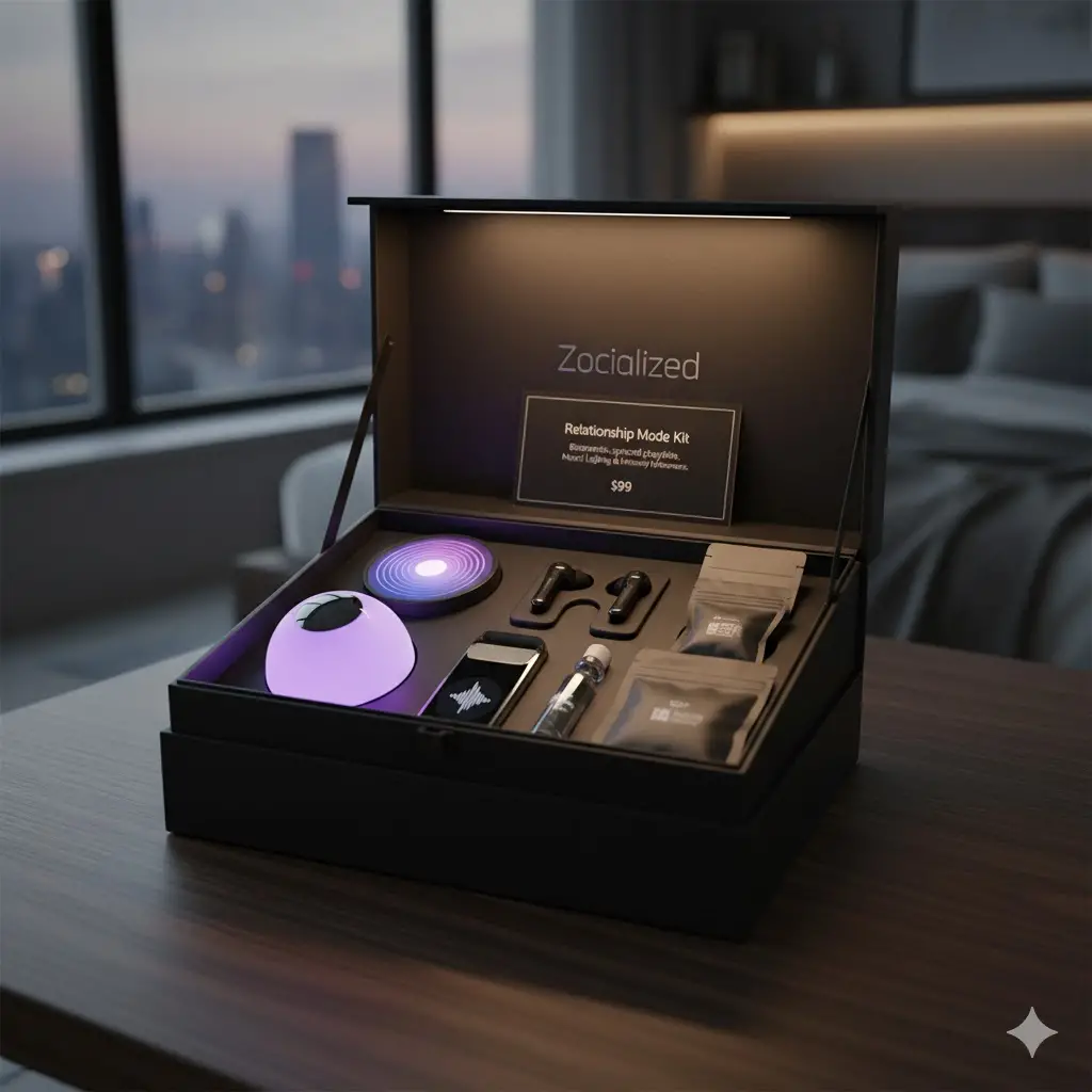 Curated boxes with biometric-synced playlists, mood lighting, and intimacy enhancers.